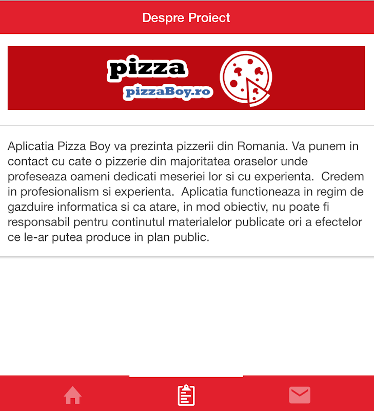 该应用程序呈现男孩比萨比萨罗马尼亚。我们在大多数的城市之一比萨店接触的地方执着的人练习他们的技能和经验。