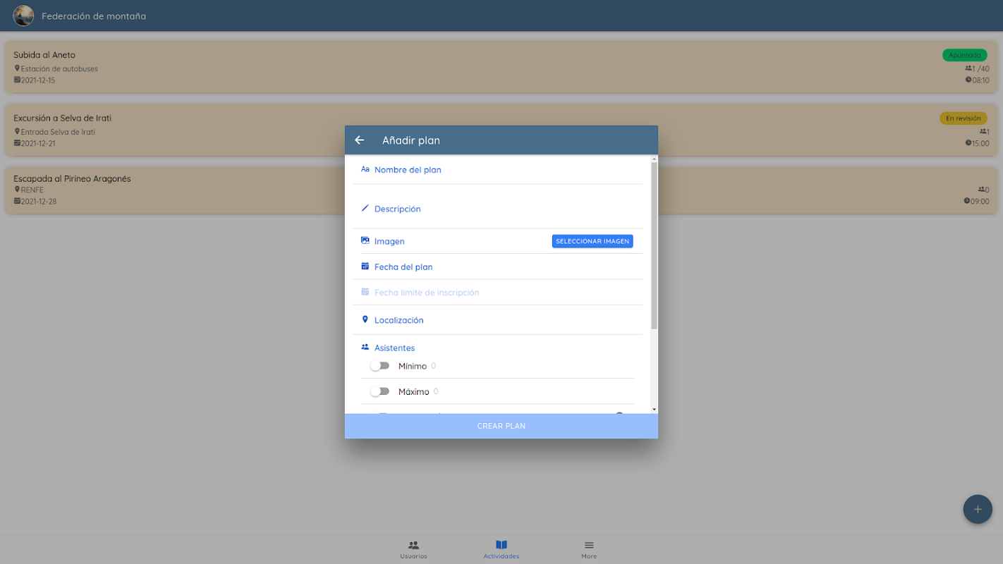 Plan&Go propone una forma sencilla de organizar planes. Registra organizadores, que podrán incluir planes para que tus usuarios puedan enterarse de todo lo que está pasando en tu organización. Configura su precio, máximos o mínimos de usuarios, descripciones, lugares y mucho más. Personaliza tu asociación para incluir su logo y hacerla reconocible. Administra quién asiste, quién puede apuntarse a los planes, y verifica quién ha subido la documentación necesaria.