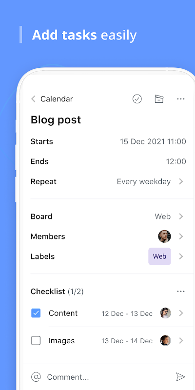根据需要创建详细的任务列表。将它们绑定到项目计划、设置截止日期和管理任务,所有这些都在一个 Trello Android 应用程序中完成。