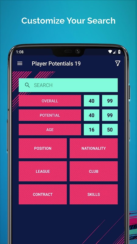Player Potentials 19应用程序有9种不同的免费过滤选项。通过总体评分,潜在评级,年龄,首选职位,国籍,联赛,俱乐部,合同和技能过滤器,可以非常轻松地在FIFA 19游戏中搜索和找到职业模式团队的玩家。此应用程序将是您在转让季节期间最大的指南。