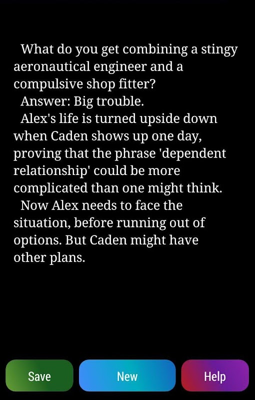 The logic of the app is to both provide a format compatible with narrative expectations (in other words: to create a text that could be plausibly seen on the back cover of a real book) and, at the same time, to allow the writer/user to fill in the details using his or her imagination. The app cannot create a complete detailed plot; it can merely allow the writer to come up with ideas.