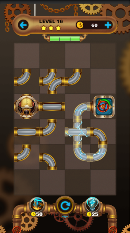 Połącz wszystkie rury, aby dać robotowi energię, po prostu dotykając ich i łącząc je razem, tworząc kompletną rurę. Nie ma limitu czasu, ale za każdym razem, gdy dotkniesz rury, woda w zbiorniku zmniejszy się. Upewnij się, że przepływ jest zoptymalizowany, aby osiągnąć 3 gwiazdki na każdym poziomie.