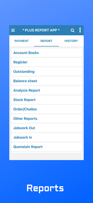 - 您可以在您的设备上轻松获取多个报告,如帐户分类帐报告、销售分类帐报告、应收/应付报告、未结报告、库存报告等。PDF/Excel/RTF/HTML 格式。