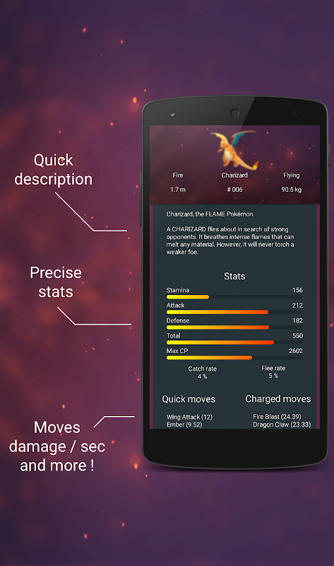 Pokedex entries, stats, location, type resistance, flee rate, catch rate, move learned and damage per second. The game will have no secret for you.
