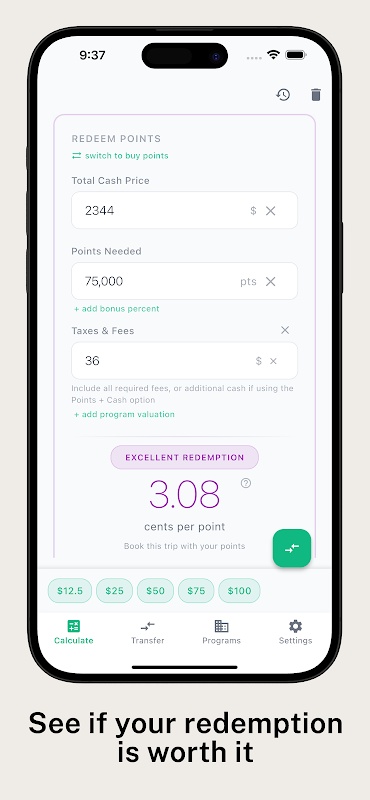 计算价值:输入现金价格和所需积分。立即查看每积分的百分比。应用程序会显示:优秀、良好、尚可或较差。