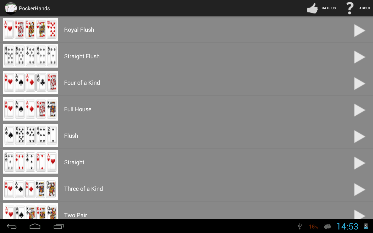 此应用程序提供了有关所有可能的手的信息。如果你开始扑克,这个应用程序将帮助你获得知识。