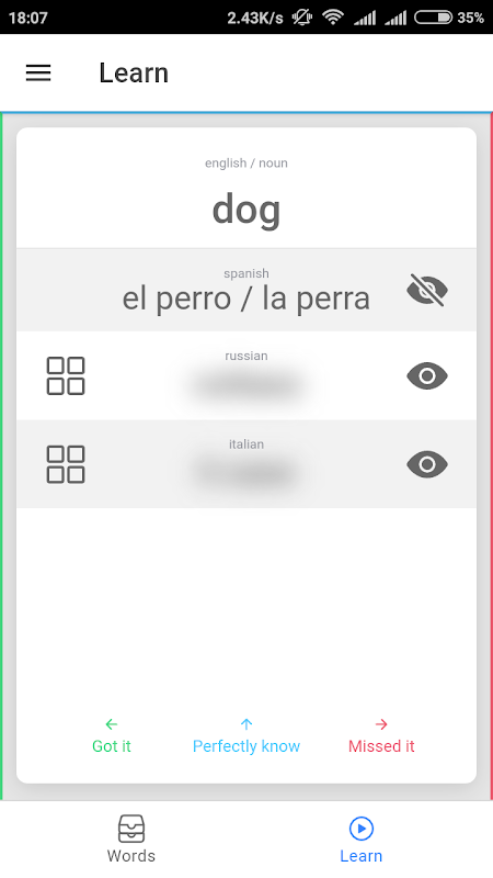 知道了 - 向左刷卡。如果这个词对你来说很难 - 向右滑动。要将单词标记为已知 - 将其滑动到顶部,这样它就不会再次出现。目前,您可以学习以下语言:德语、法语、西班牙语、意大利语、波兰语、俄语、英语、乌克兰语和白俄罗斯语。