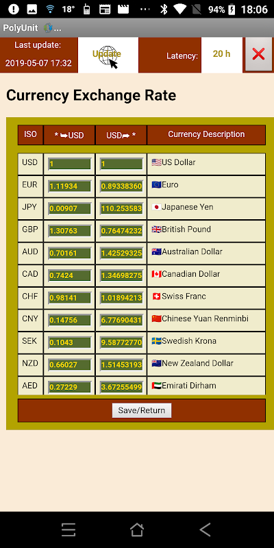 The PRO version of PolyUnit allows user to define their own units and constants. Need to convert Japanese Yen into Euro based on the gold value? Simply define those according to a reference unit (an ounce of gold) and convert. Add additional self-defined currencies if you need to use a different rate from the current fluctuating one.