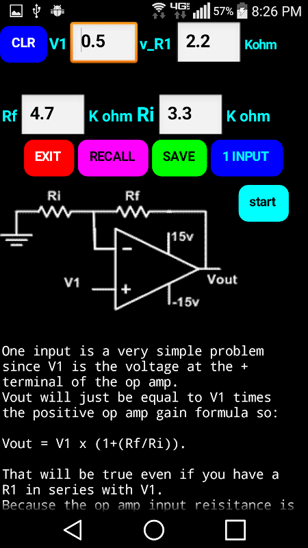 The app leads the student step by step through solutions for 1, 2 and 3 input positive gain operational amplifiers. It is also useful as a homework aid to check your steps and answers.