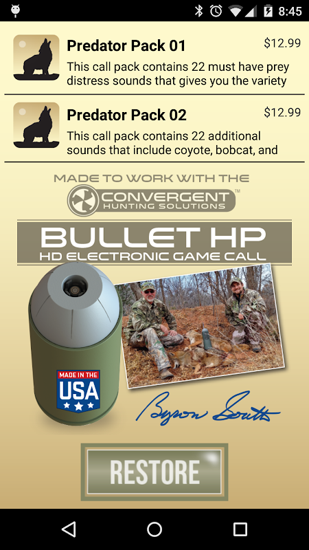 Predator Pro 是专业级捕食者狩猎工具包,专为与 Bullet HP 电子呼叫配合使用而设计。土狼猎人、狐狸猎人,以及任何狩猎任何种类掠食者的人,都会通过 Predator Pro 移动应用看到捕食者狩猎的有效性。