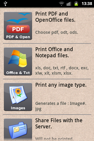 Print PDF documents, Office, OpenOffice, txt and all kind of images, from your Android device directly to any printer connected to your PC. (Including network and WiFi printers).