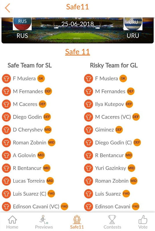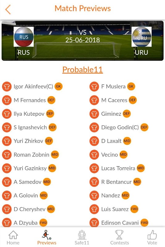 我们的应用程序包括“匹配预览,Safe11,竞赛代码和船长投票”等功能。