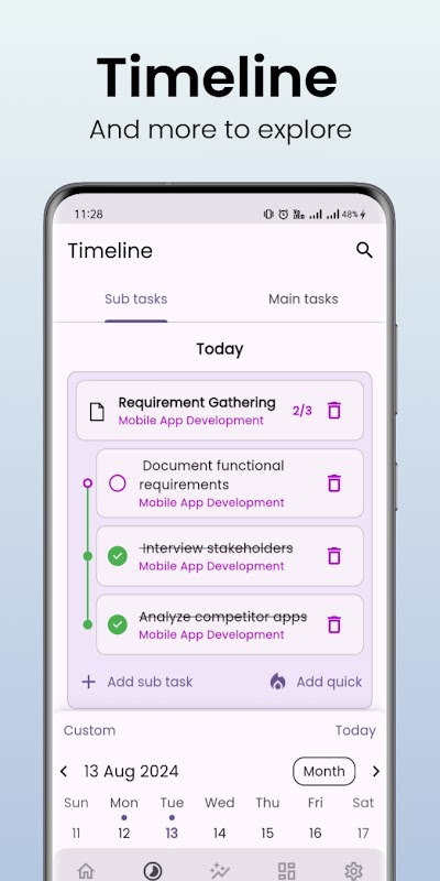 📅时间线视图:以清晰的时间线格式可视化带有截止日期和日期的任务。有效管理计划外任务。