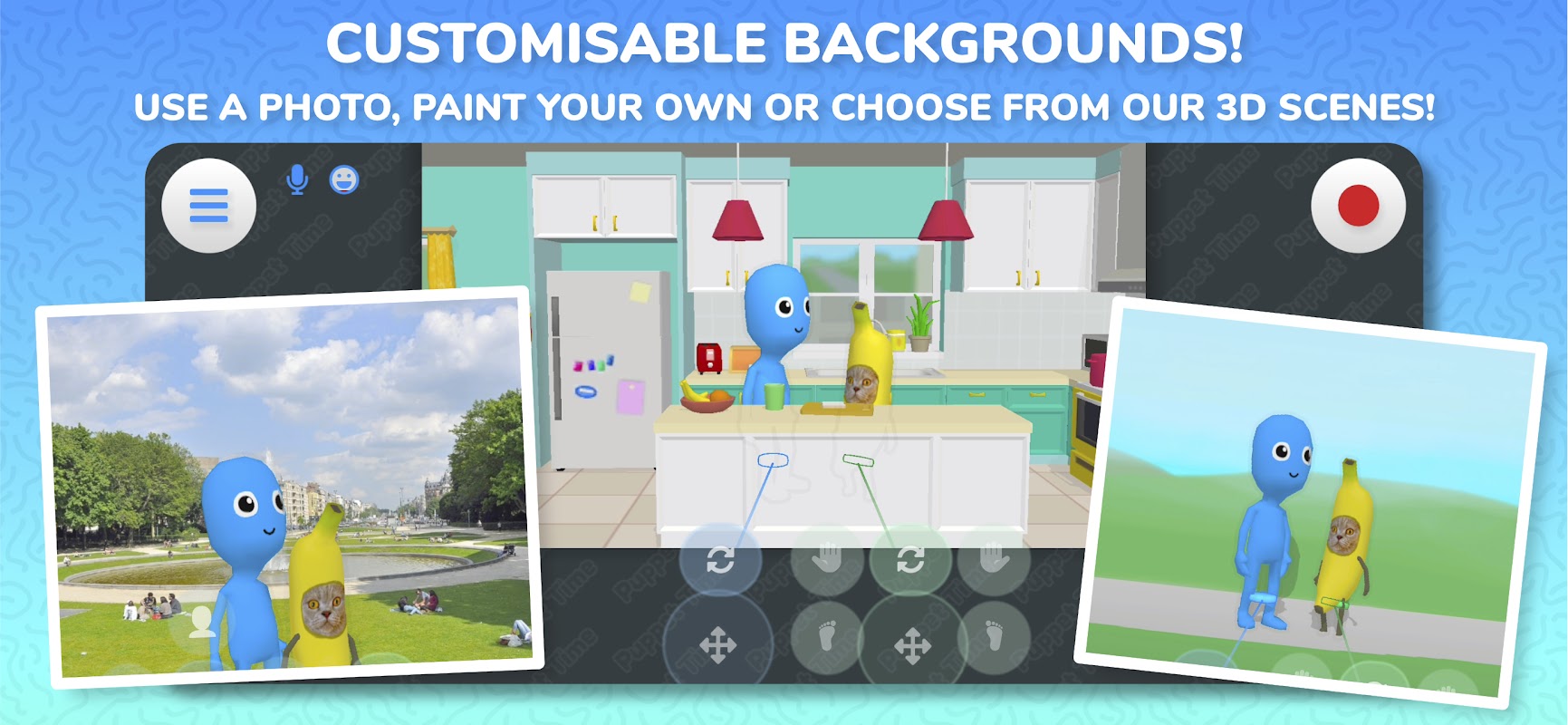 表演时间到了!按下录制按钮,让木偶魔术开始吧。与您的木偶一起玩耍、互动和即兴表演,用视频捕捉每一个令人愉快的时刻。Puppet Time 让记录和分享您的创作变得轻而易举。轻松制作炫酷有趣的木偶动画视频