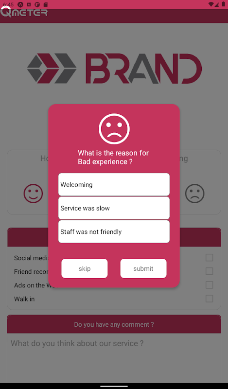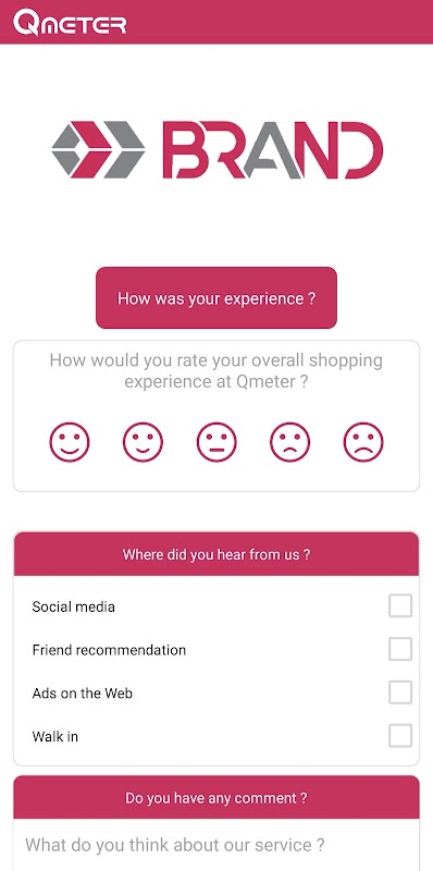 Qmeter 是所有希望通过简单方式从客户那里获得反馈的企业和组织的解决方案。我们创建的系统可以帮助企业领导者很好地了解他们的客户需求并了解他们的弱点。此应用程序是基于 Web 的服务 Qmeter 的一部分。使用我们的网络平台进行配置和设置反馈表,分析收集到的数据并提供有关客户满意度的详细报告。应用程序部分仅用于演示反馈模板并从使用此应用程序的客户那里获取信息
