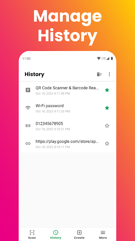 QR Code Scanner 允许您控制所有数据。将扫描项目添加到收藏夹、清除历史记录甚至手动禁用历史记录功能。