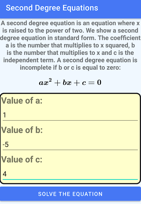 用户可以求解任何二次方程。为此,您必须引入系数 a、b 和 c 的值。如果方程是标准形式,
