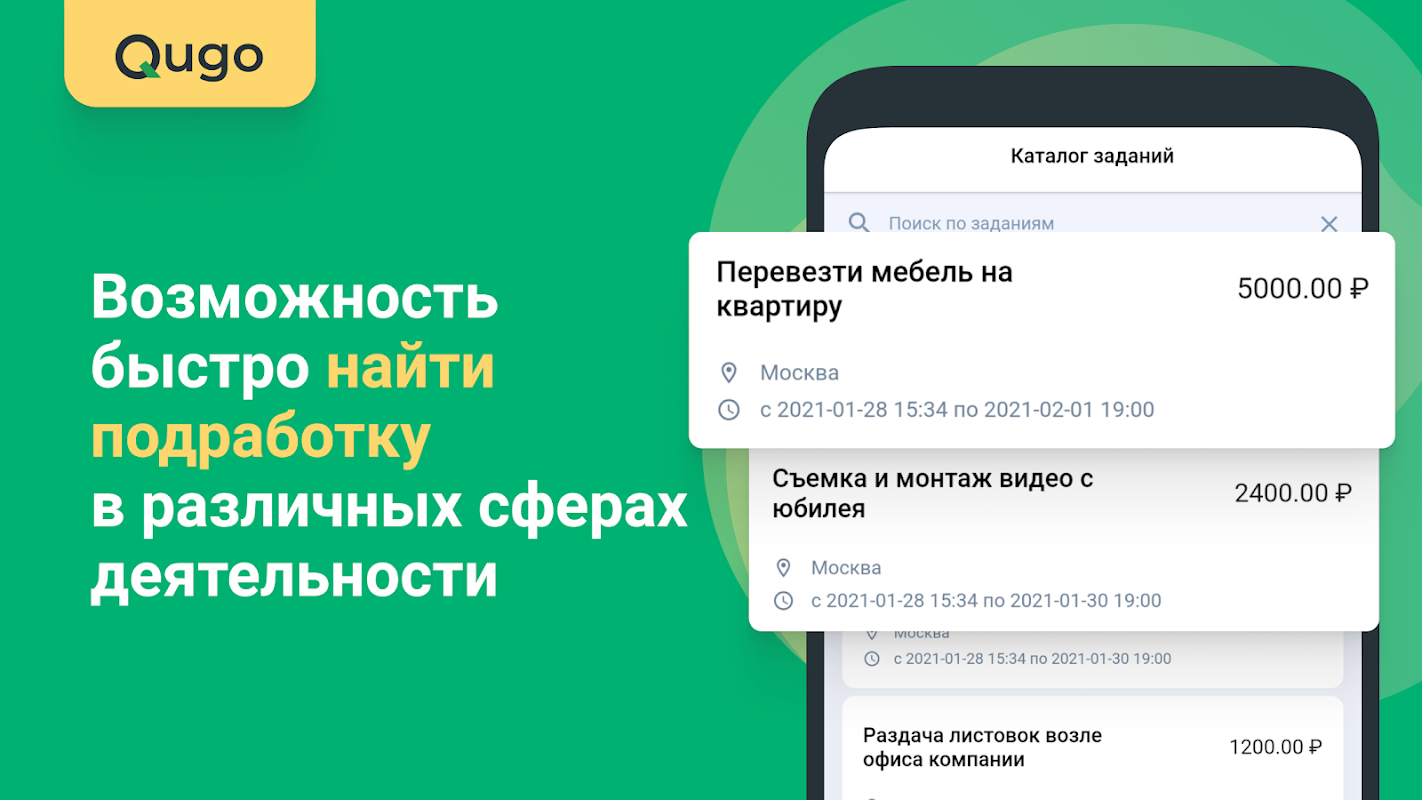 该应用程序几乎适合所有场合。例如,您想找到一个远程工作并赚取额外的钱。来到QUGO并开始寻找各种订单:翻译,撰写文本,保姆服务等等。提交您的订单执行请求,并获得绝佳的机会来赚取额外的钱。或者,您需要附近的帮手,水管工服务,房屋清洁,修理工,“丈夫一个小时”,装载机,技术人员,建筑工人,公寓清洁,垃圾收集等-前往QUGO寻找合适的工作人员。