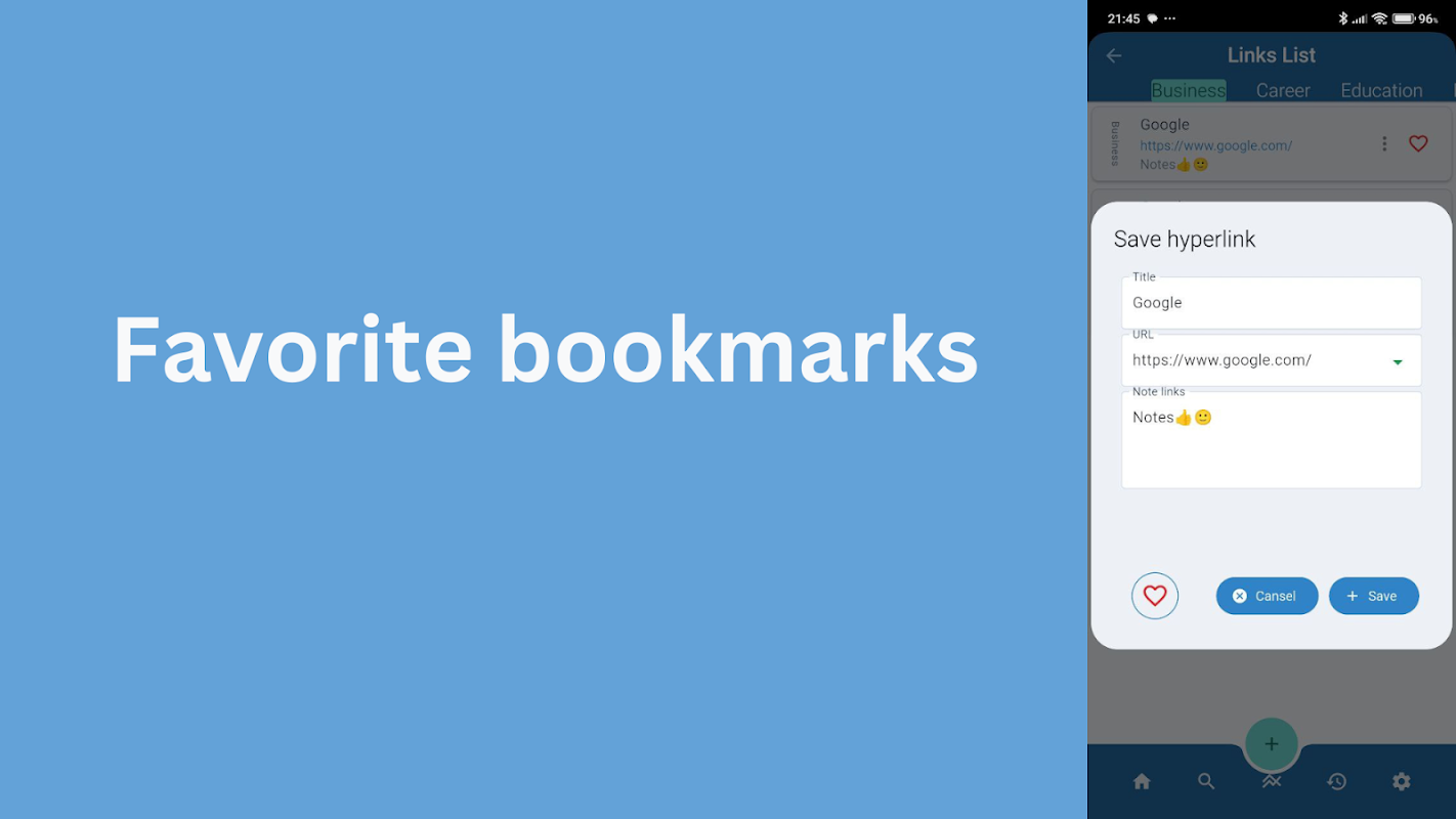 这款书签管理器应用针对 Android 进行了优化,无广告、轻量级且速度极快。无论您是学生、专业人士还是普通用户,快速书签管理器都能简化网络访问,帮助您保持井然有序。立即下载,体验在移动设备上管理链接的最佳方式!