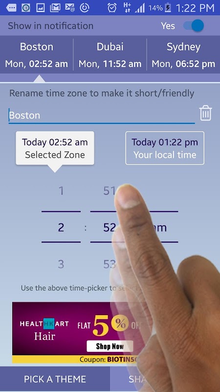 A simple and relatively helpful app to easily find the World time that you constantly requires. You can view 3 different time zones anytime from any app. By simply swipe down the notification bar. You can also change the theme as per your interest.