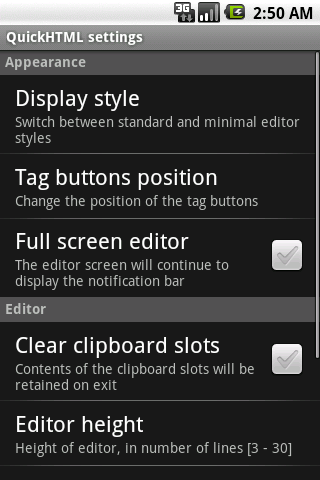 • Customizable interface - change size of screen, size of the editor, position of the tag buttons etc