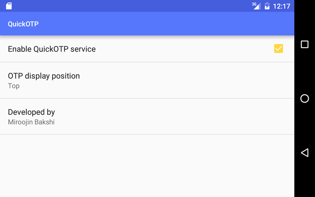 For users handling with money transactions online (online shopping, bank transfers, mobile recharge/top-up), it can become cumbersome to deal with One Time Password (OTP) based authentications. The user has to switch to the messaging app, open the appropriate SMS and memorize/copy the OTP every time. With QuickOTP, you can bypass this process. QuickOTP displays the OTP in a lucid and non-intrusive manner along with an option to quickly copy the OTP as soon as you receive your OTP message. The user does not have to switch apps during the transaction.