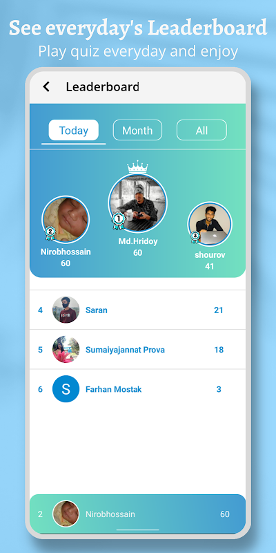 - You can see daily Quizzes Leaderboard, monthly Quizzes Leaderboard, All Quizzes Leaderboard.