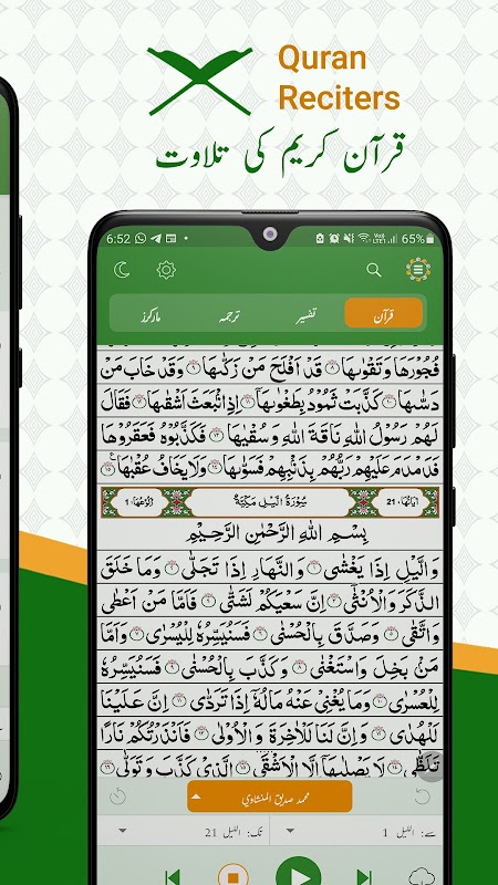 易于使用的应用程序,包括以下优秀功能:古兰经背诵、评论和翻译以及乌尔都语、印地语、卡纳达语、波斯语、普什图语和其他语言的古兰经翻译、夜间模式、书签、笔记和分享。具有吸引人的界面。