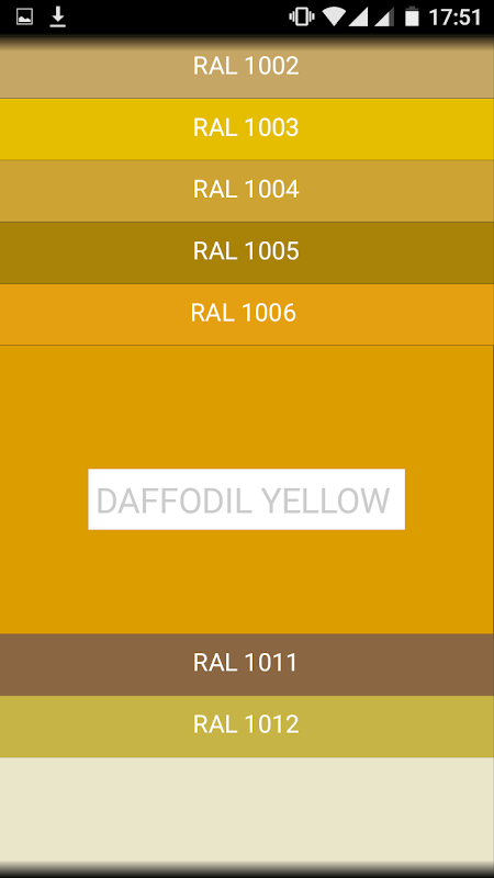 Az alkalmazás a Classic RAL rendszer szerinti szabványos színek áttekintését jeleníti meg, kódokkal, írásban és kimondva.