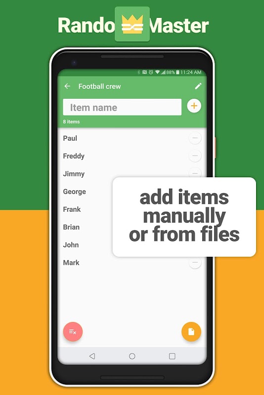 Random Master is a utility app that helps you to generate random numbers within different intervals, pick random items from lists and also allows you to generate random teams. The lists can be added manually item by item or loaded from files stored on your phone.