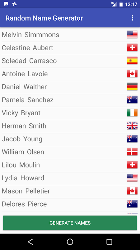 这种随机名称生成将创建一个从许多不同国籍的随机名称和地址。您也可以选择生成的名字的性别和名字复制到Android剪贴板。