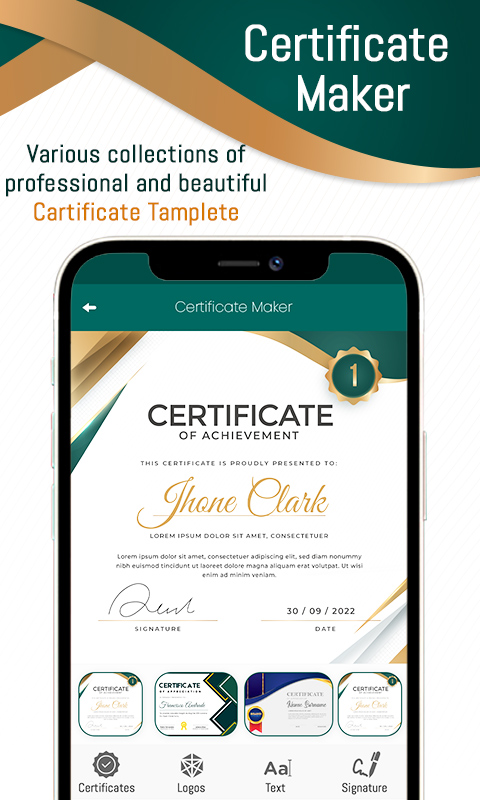 证书制作器包含不同类型的证书庙宇,其中包括获奖证书,并具有许多文本样式,您可以借助这些样式在证书中添加一些文本。 Certificate Maker Pro 应用程序附带精美的内容,可免费使用!