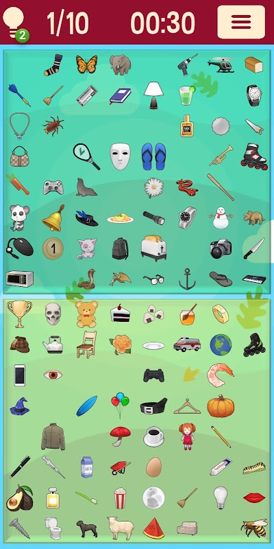 • 难度:难度越高,棋盘上的物体越多。简单:18个物体。疯狂:数百个物体,找到一个重复的物体。此外,在疯狂难度下,你需要上下滑动屏幕才能查看所有图标。