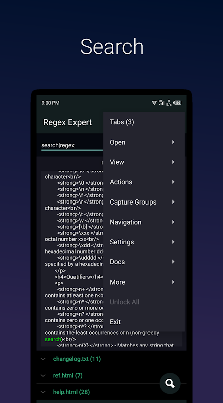 Regex Expert searcher 是一款使用正则表达式搜索多个文本文件的应用程序。也可以用作正则表达式测试器,您可以在其中输入一些文本并匹配模式。此文件搜索器应用程序还允许使用替换文本替换所有文件中找到的匹配项,并将它们保存在新文件中。 RegEx 搜索器使用 Java 和 JavaScript 引擎来执行搜索。导航在此文件搜索器应用程序中非常有效,因为只需滑动即可移动到下一个或上一个选项卡。它还具有称为区域搜索的独特功能,使您可以仅选择文件中要使用正则表达式搜索的部分文本。也可以过滤掉某些特定的捕获组,使其在匹配和替换中不可见。 Reg Ex 搜索还使您能够保存模式以供将来使用。在您键入时启用自动搜索以匹配正则表达式。 Android 的正则表达式搜索应用程序也有一个备忘单来查看元字符、修饰符和量词。