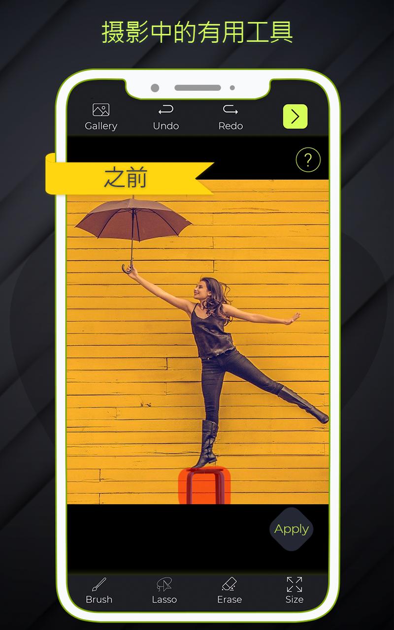 安装删除对象2021-删除不需要的对象,然后打开应用并允许图库和相机访问权限。现在,选择图片后,您可以从“相机”或“图库”中选择一张照片,您将拥有不同的编辑工具,如“画笔”,“套索”,“擦除”和“调整”或“魔术擦”。您可以应用每种工具来获得所需的结果,例如添加表情符号或更改此应用程序已具备的过滤器。完成编辑后,单击“应用”以保存更改,您可以保存并用新照片替换照片。