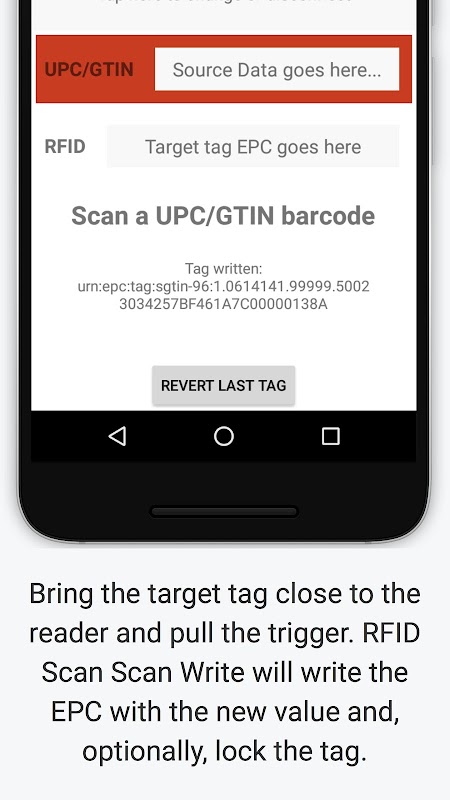 RFID Scan Scan Write旨在通过行业标准和定制EPC快速调试UHF RFID标签。该应用程序可以获取GS1条形码信息,然后使用符合GS1 SGTIN-96,GRAI-96或GIAI-96的EPC对标签进行编码,或者直接使用扫描的十六进制/ ASCII数据生成自定义EPC值。标签也可以被锁定并指定密码,以防止未经授权的修改。