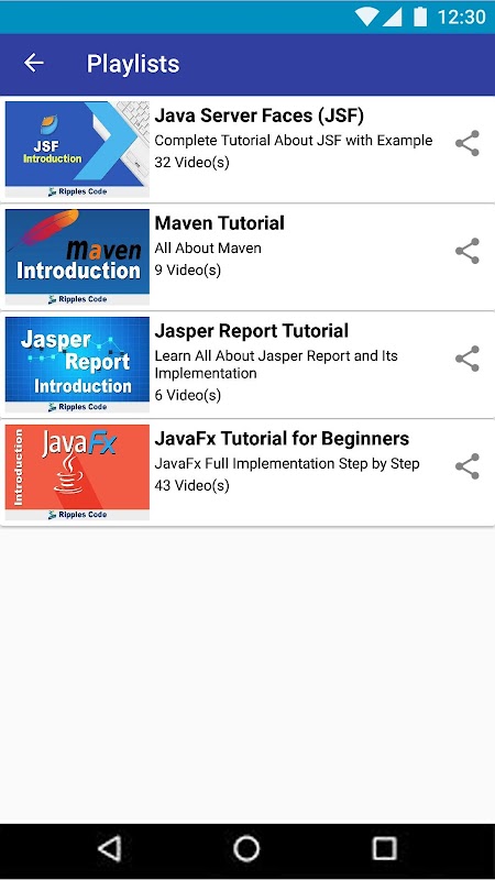 Welcome to the World of FREE Software Training Video Tutorials. Ripples Code app is designed to train you on various technologies like: JavaFx,Jasper Report,Maven, JSF and many more trending technologies.