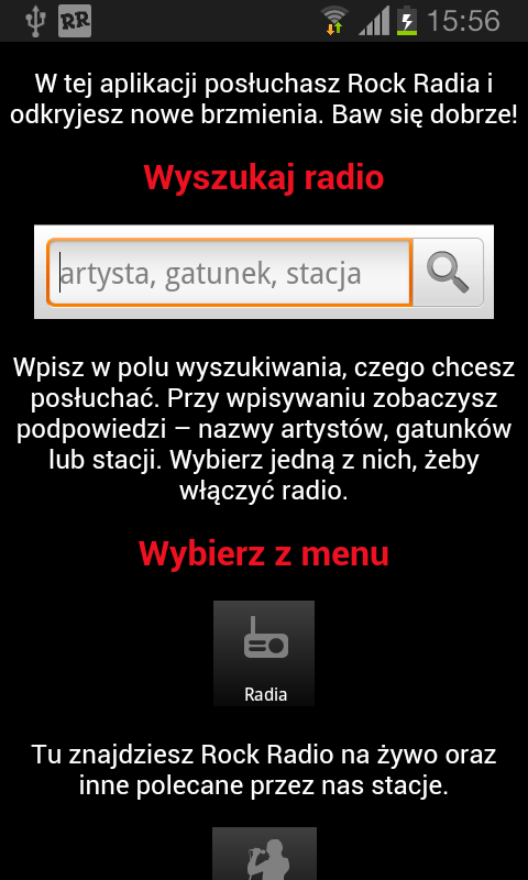 Żeby włączyć Rock Radio, wystarczy uruchomić aplikację. Podczas słuchania zawsze możesz sprawdzić tytuł i wykonawcę aktualnie granej piosenki, zobaczyć okładkę płyty z której pochodzi utwór, a także sprawdzić co będzie grane za chwilę.