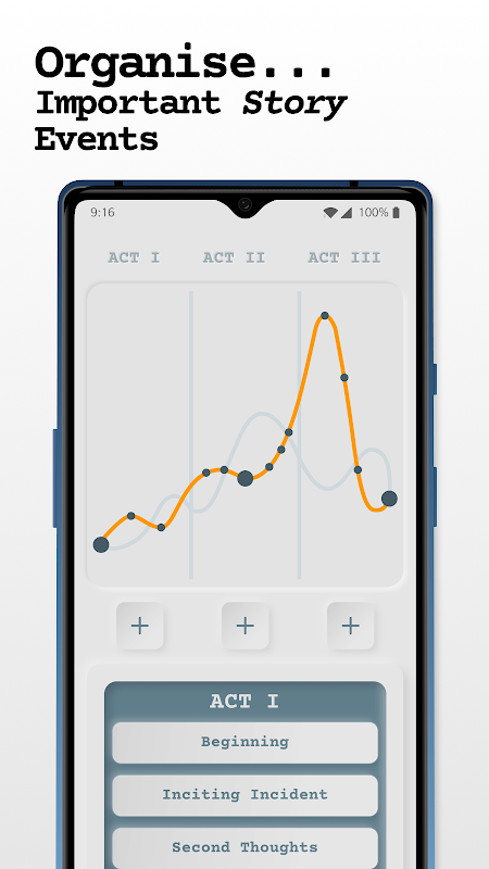 ✔️ Organise and Navigate your story further with a three-act-structure graph tool;