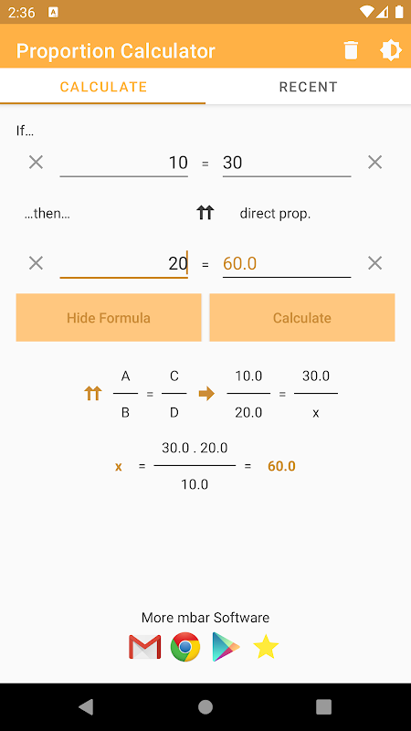 此应用通过输入三个已知值并单击“计算”来计算比例(直接或间接),也称为“三个规则”。该应用程序将为您计算缺失值!