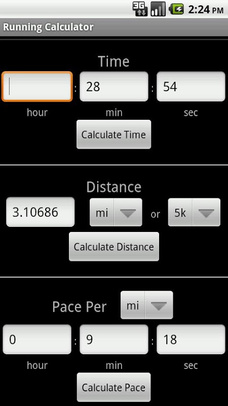 A simple pace/distance/time calculator for runners. Free and contains no ads.