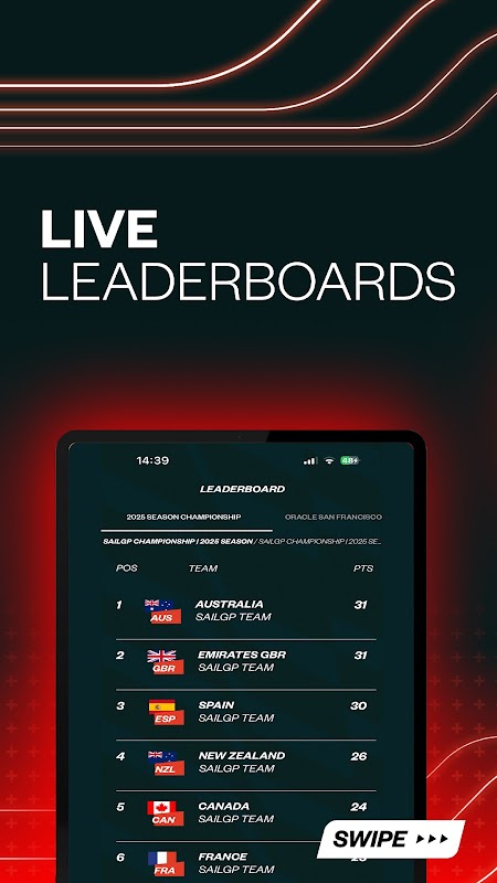 鸟瞰整个比赛,并提供关键信息,例如终点线在哪里、每艘船的行驶速度以及还剩多远。 SailGP 应用程序是您的终极比赛伴侣,可确保您不错过任何比赛!