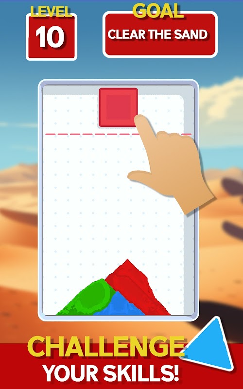 使用响应式触摸输入向左或向右拖动,控制每个沙子形状的命运。一旦您决定了最佳位置,请释放您的触摸,见证沙子的形状在逼真的沙子物理作用下优雅地落下。敬畏地看着它与障碍物和现有的沙子相互作用,在下降时保持其形状。