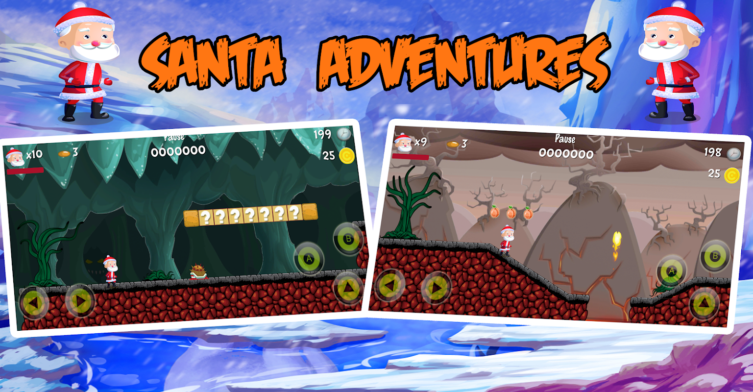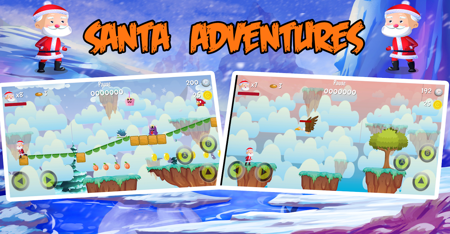 Amazing " Santa Adventure " Game with many stages, varying in difficulty, you have to overcome difficulties with caution and concentration, and get more gold pounds to be able to try again.