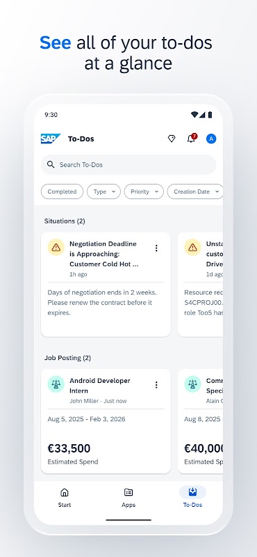 SAP Mobile Start 是将业务直接放在指尖掌控的入口点。通过统一而直观的用户界面访问重要的业务信息、应用和流程。该应用使用小部件和推送通知等最新设备和操作系统功能,确保您从不错过重要事件。SAP Task Center 集成将所有任务组合在一个用户友好的视图中,允许快速处理任务以加速业务流程。在随附的智能手表应用中持续跟踪您的待办事项和 KPI。利用 SAP Mobile Start,您可以随时随地做出明智而及时的决策并提高您的生产力。