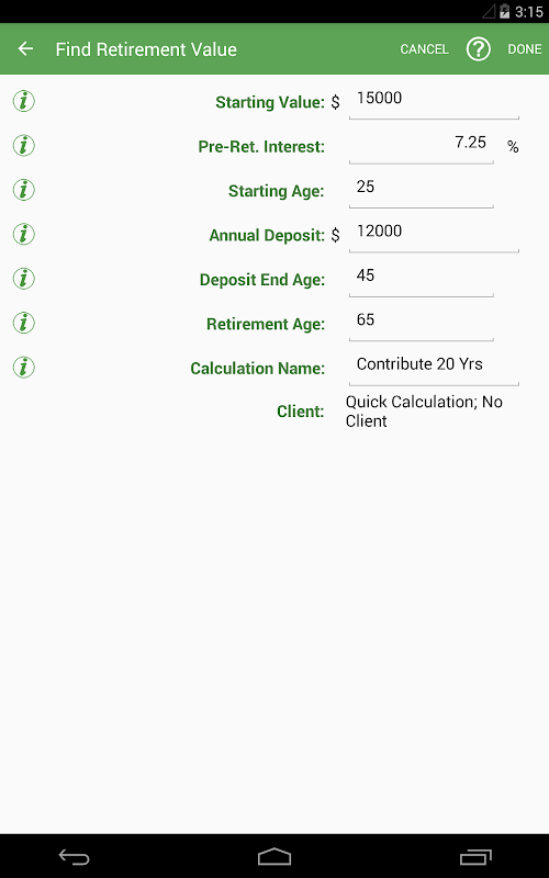The Savings Estimator's main purpose is to help you to simply and clearly explain your clients' financial situation, and lay out for them what steps they'll need to take to attain their goals. To that end, the app supports many different Calculation types; choose the right one for each of your clients. The Calculation types are as follows: