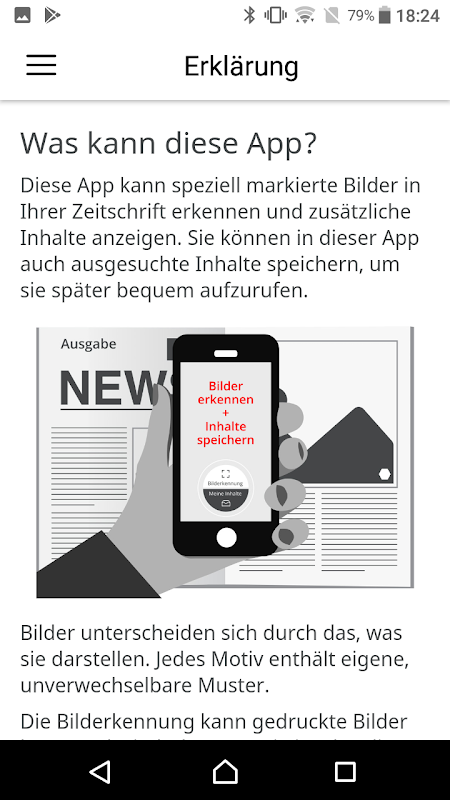 In Abhängigkeit von dem abgedruckten Thema stellt die Scan AR+ App automatisch multimediale Zusatzinhalte bereit. Die Nutzer halten Ihre Smartphones einfach über die gedruckten Seiten und sehen eine Liste mit verschiedenen Optionen – zum Beispiel einen Link, ein Video oder einen 360 Grad Rundgang. Durch das Antippen der einzelnen Optionen werden die Inhalte aktiviert und angezeigt.