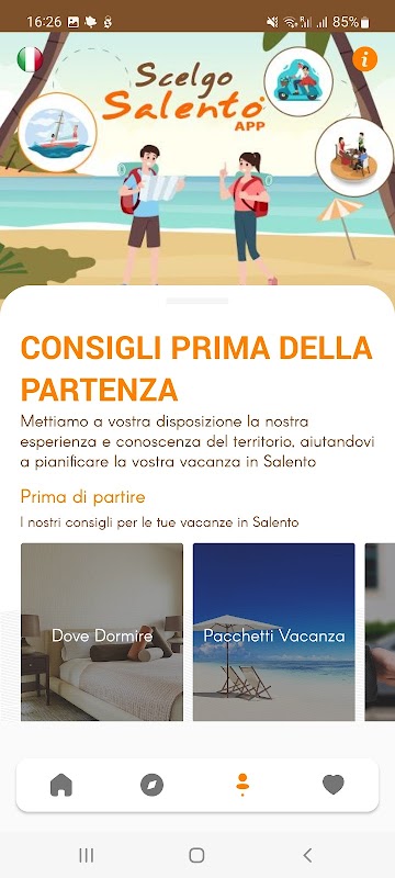 我选择 Salento 应用程序提供数百个信息表,其中包含 Salento 的全部旅游优惠,包括描述、照片、地理位置、好奇心和建议。通过单击心脏,可以将每张卡片添加到您的个性化行程中,对于每张卡片,它会显示有多少用户选择了该地点或计划在萨伦托度假的活动。