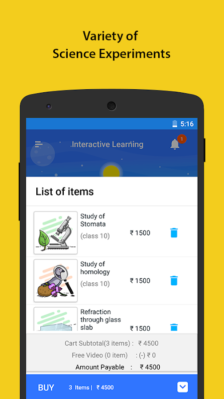 Extramarks Science Experiments App takes you through a complete virtual journey of an experiment with complete listing of materials required, objective of the experiment, theory, process involved and precautions to be taken. Once the experiment is demonstrated, a conclusion is provided for better learning outcomes. What more? After observing the entire process, you can perform an experiment on your own with the ‘Your Turn’ feature where experiments can be conducted with step by step and easy to understand instructions.