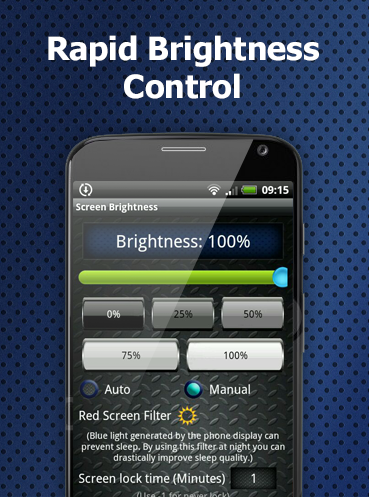 Display brightness is adjusted using a slider or preset buttons for default brightness levels. The brightness can be set low or using the controller can be set at the maximum possible power for your phone!